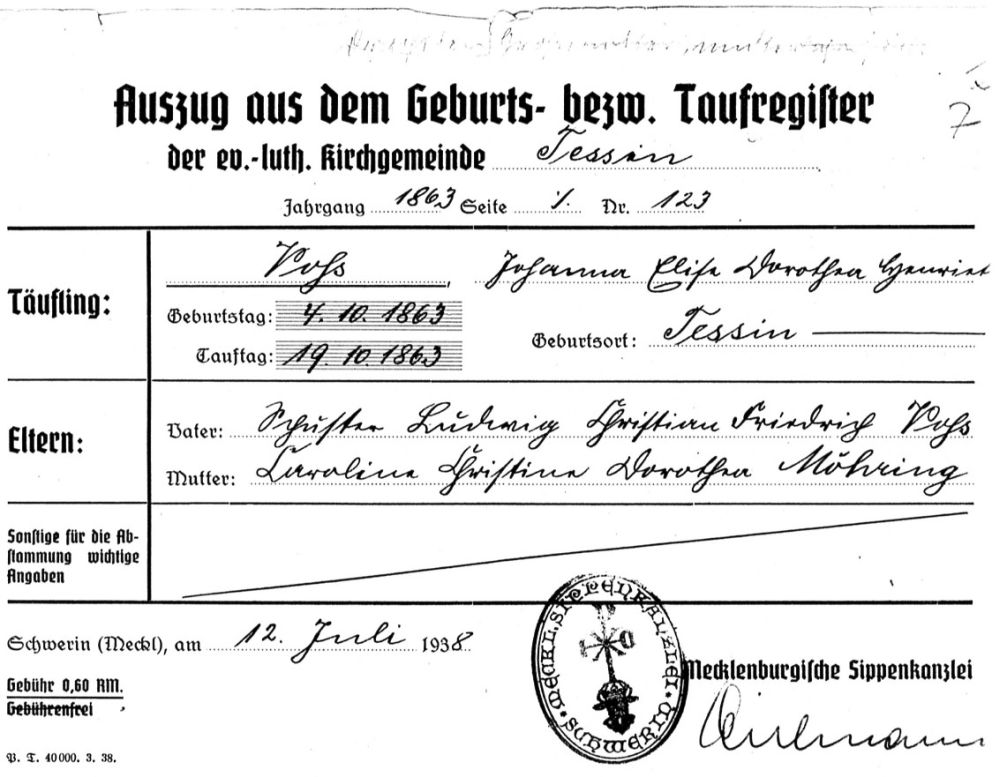 | Taufe einer Schwester | Johanna Elise Dorothea Henriette VOß 19. Oktober 1863 (Alter 10 Jahre) |