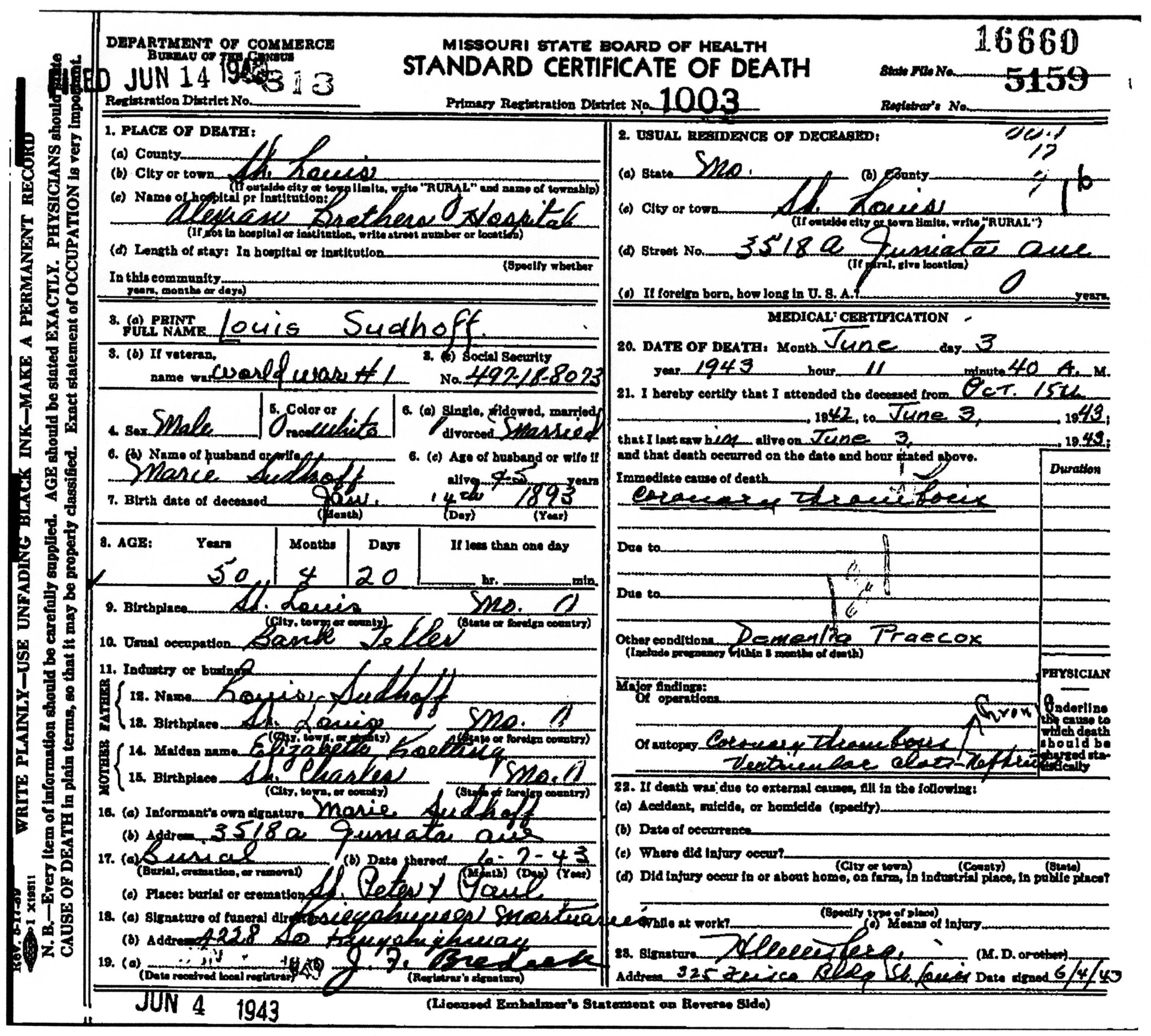 | Tod eines Vaters | Louis SUDHOFF jr. 3. Juni 1943 (Alter 22 Jahre) Quelle: Find a grave |