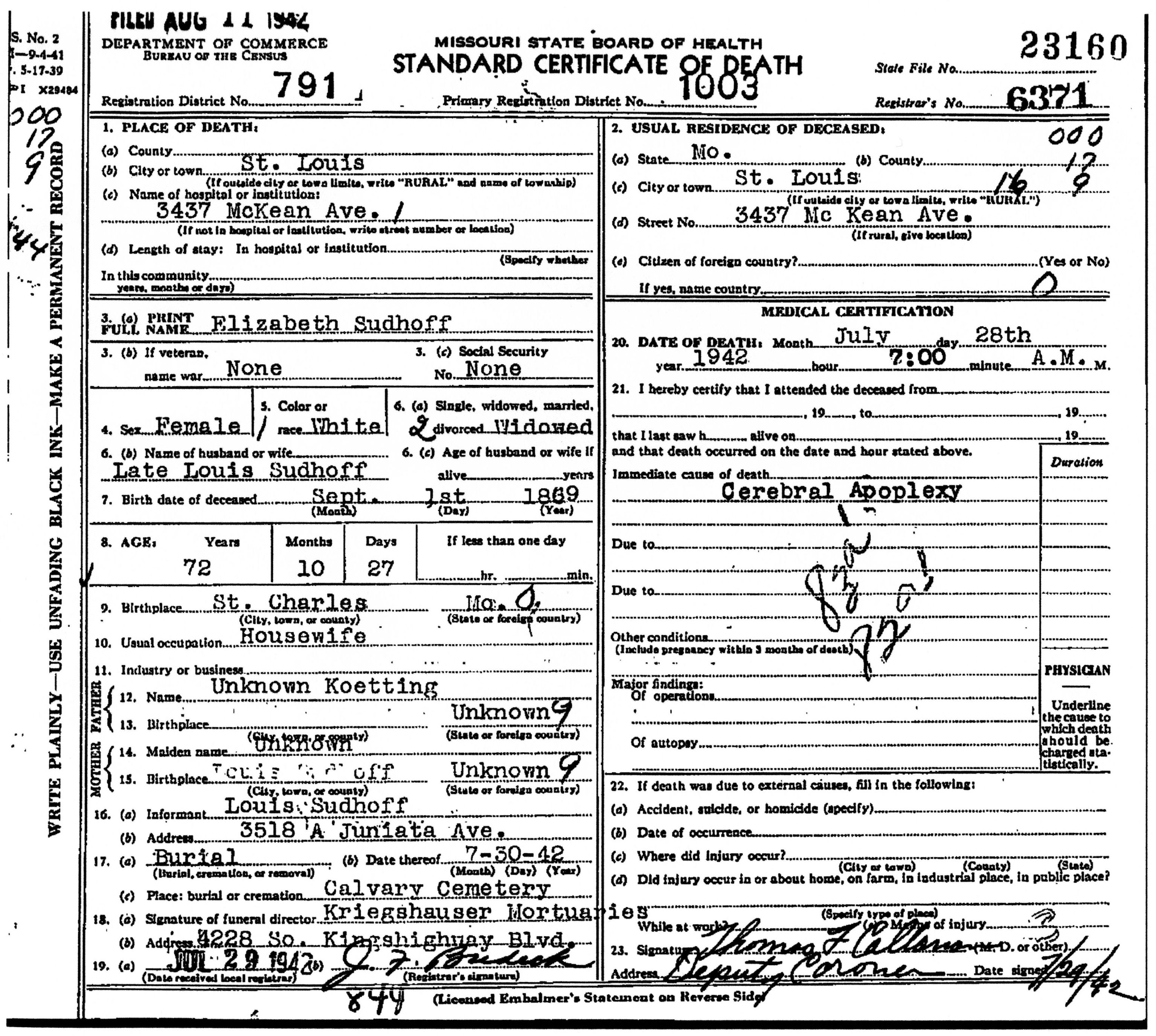Louis SUDHOFF jr. Geburt: 4. Januar 1893 26 23 — St. Louis, St. Louis, Missouri, USA Tod: 3. Juni 1943 — St. Louis, St. Louis, Missouri, USA |