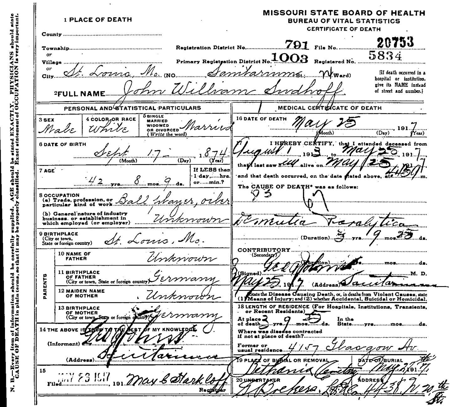 Geburt: 17. September 1874 45 40 — St. Louis, St. Louis, Missouri, USA Tod: 25. Mai 1917 — St. Louis, St. Louis, Missouri, USA |
