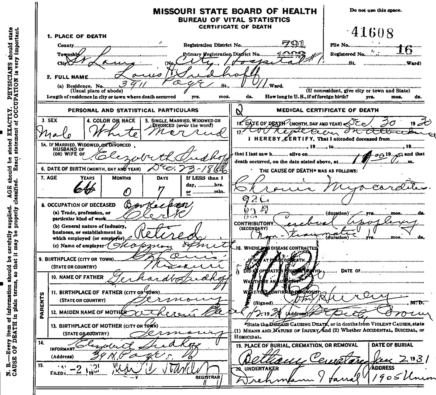 Gerhard Heinrich Louis SUDHOFF Geburt: 13. Dezember 1866 37 32 — St. Louis, St. Louis, Missouri, USA Tod: 30. Dezember 1930 — St. Louis, St. Louis, Missouri, USA |