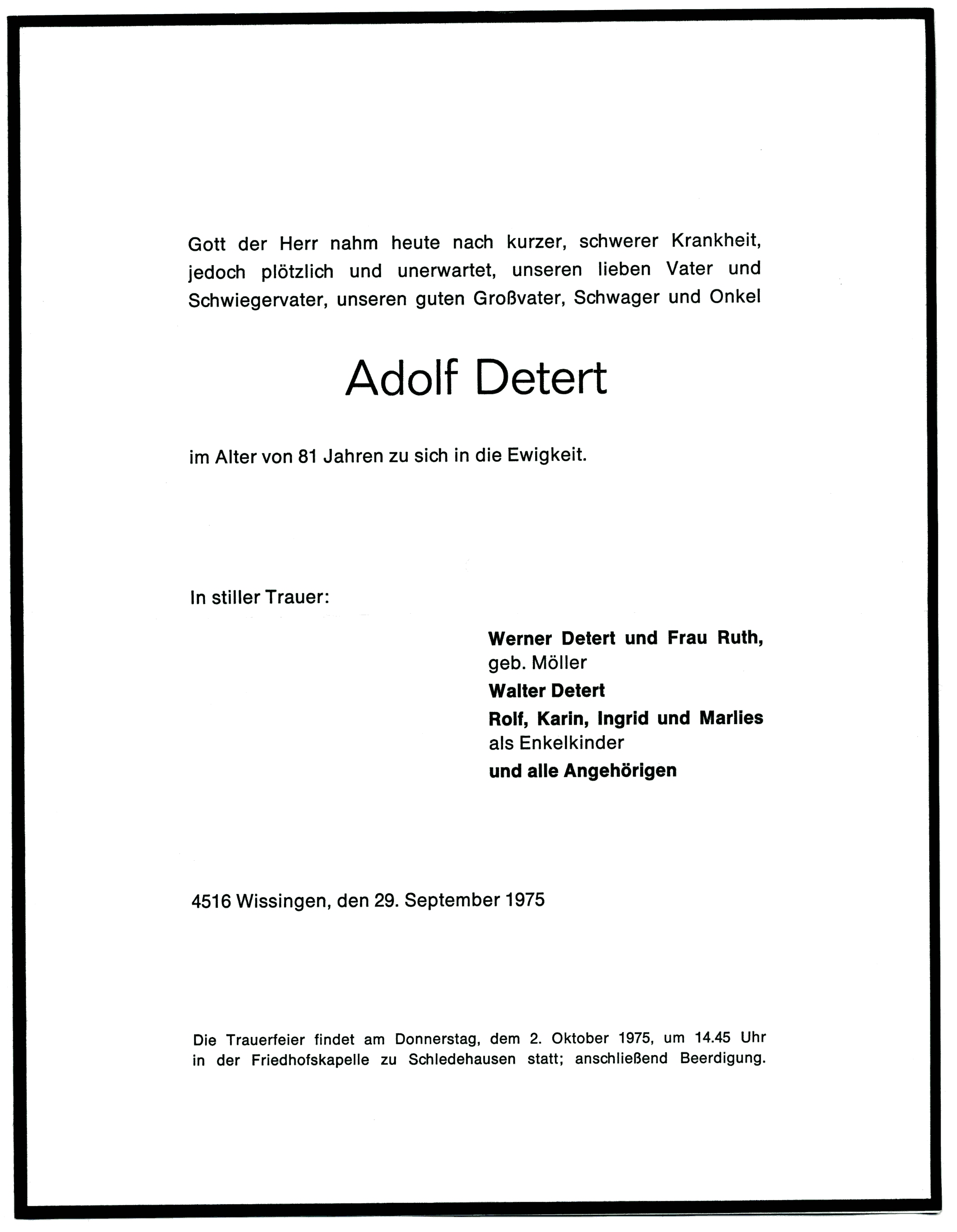 Hermann Heinrich Christian DETERT Geburt: 29. Dezember 1887 38 31 — Wissingen (Bissendorf), Osnabrück, Niedersachsen, DEUTSCHLAND |