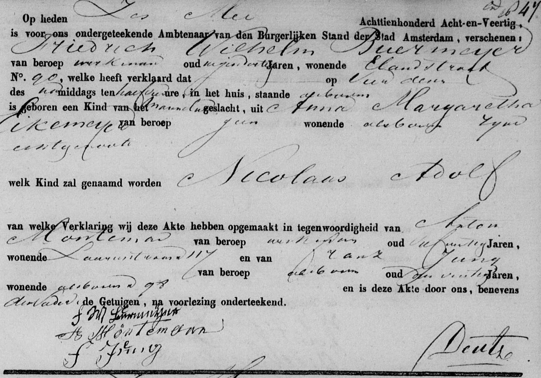 | Geburt eines Bruders | Nicolaas Adolf BUERMEIJER 4. Mai 1848 (Alter 22 Monate) Quelle: Amsterdam, Civil Registration |