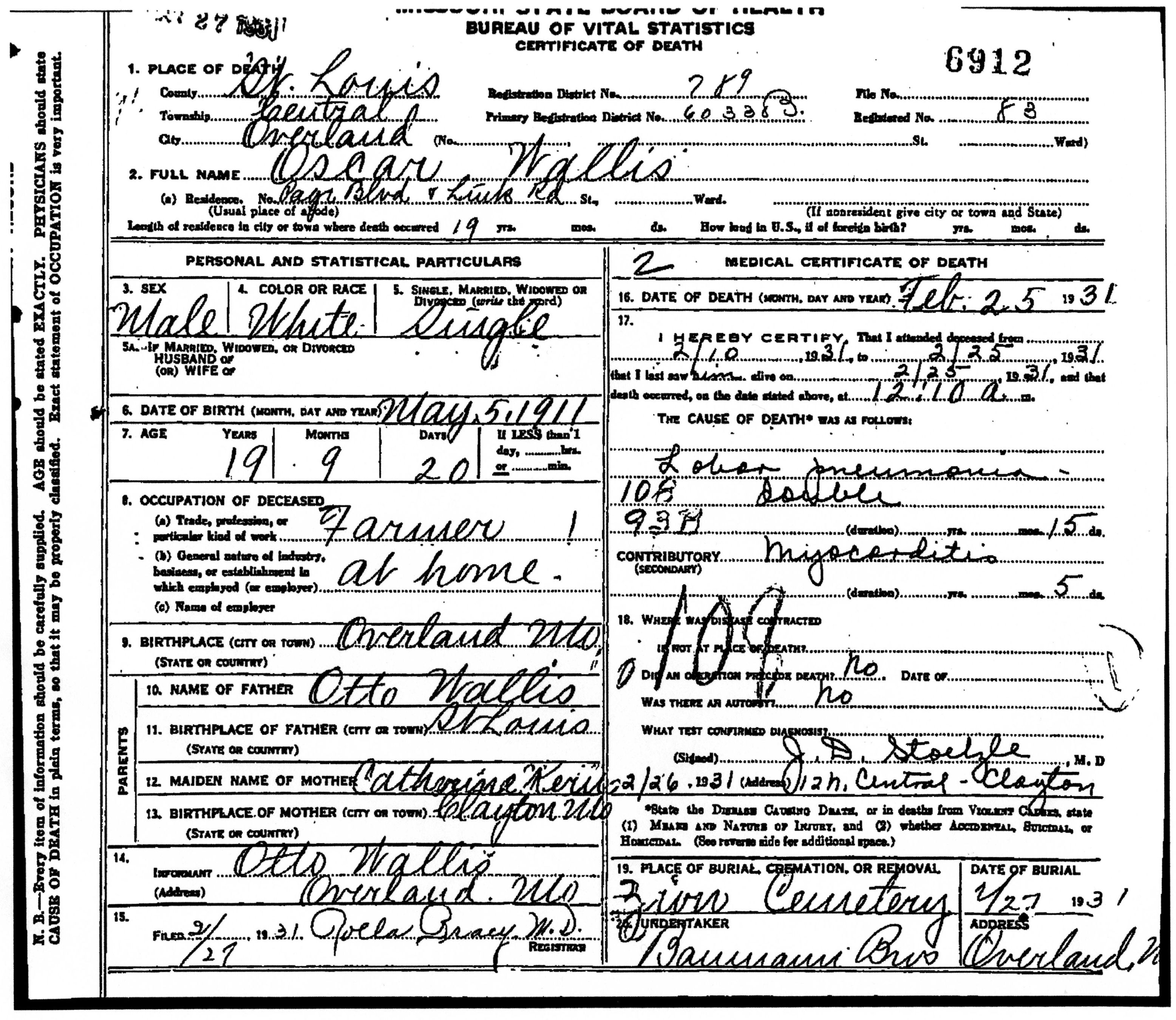 Oscar W. WALLIS Geburt: 5. Mai 1911 36 32 — Central Township - Farm, St. Louis, Missouri, USA Tod: 25. Februar 1931 — Overland, St. Louis, Missouri, USA |