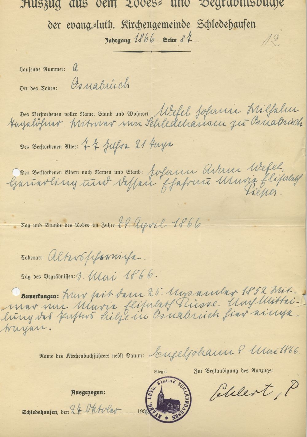| Tod eines Vaters | Johannes Wilhelm WIEFEL 29. April 1866 (Alter 40 Jahre) |