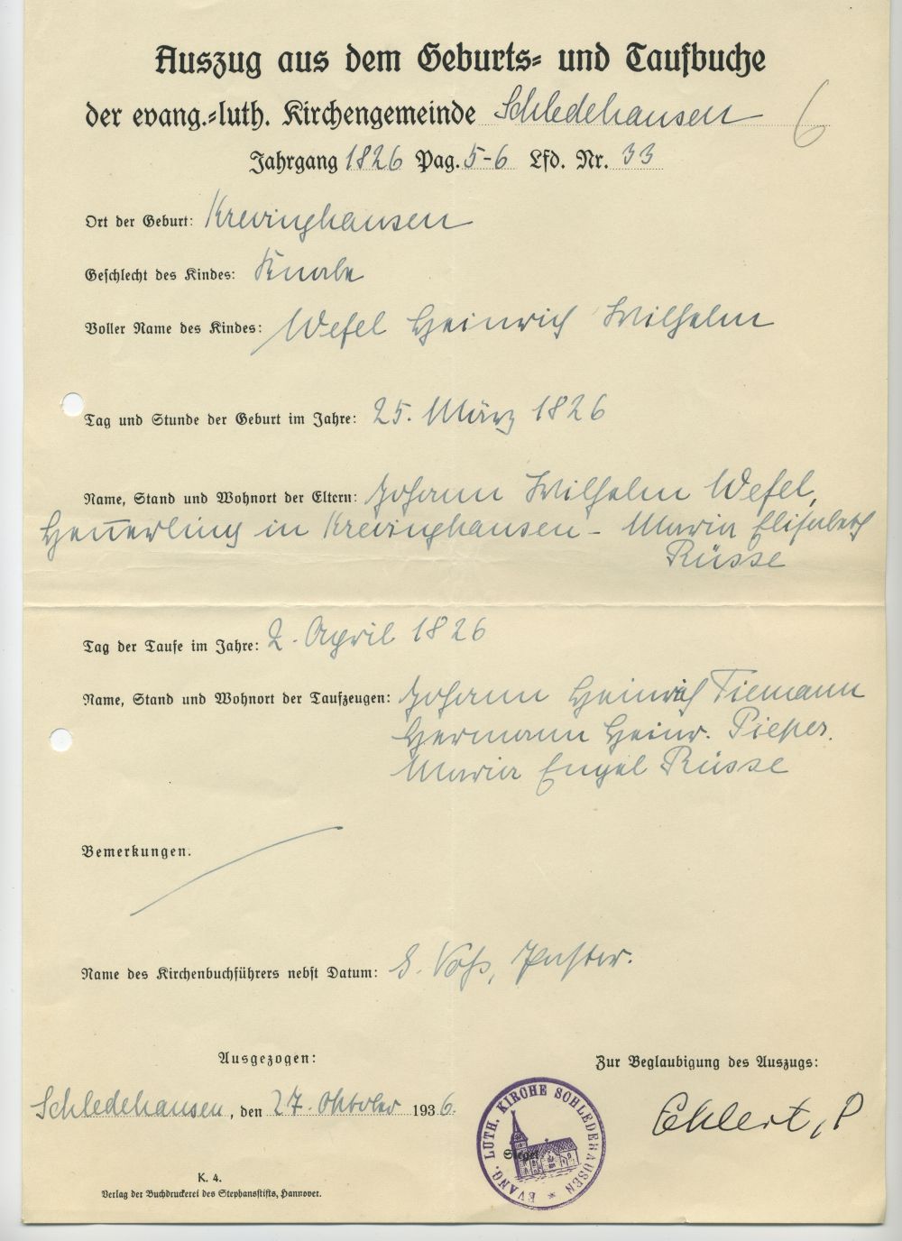| Taufe | 2. April 1826 (Alter 8 Tage) |