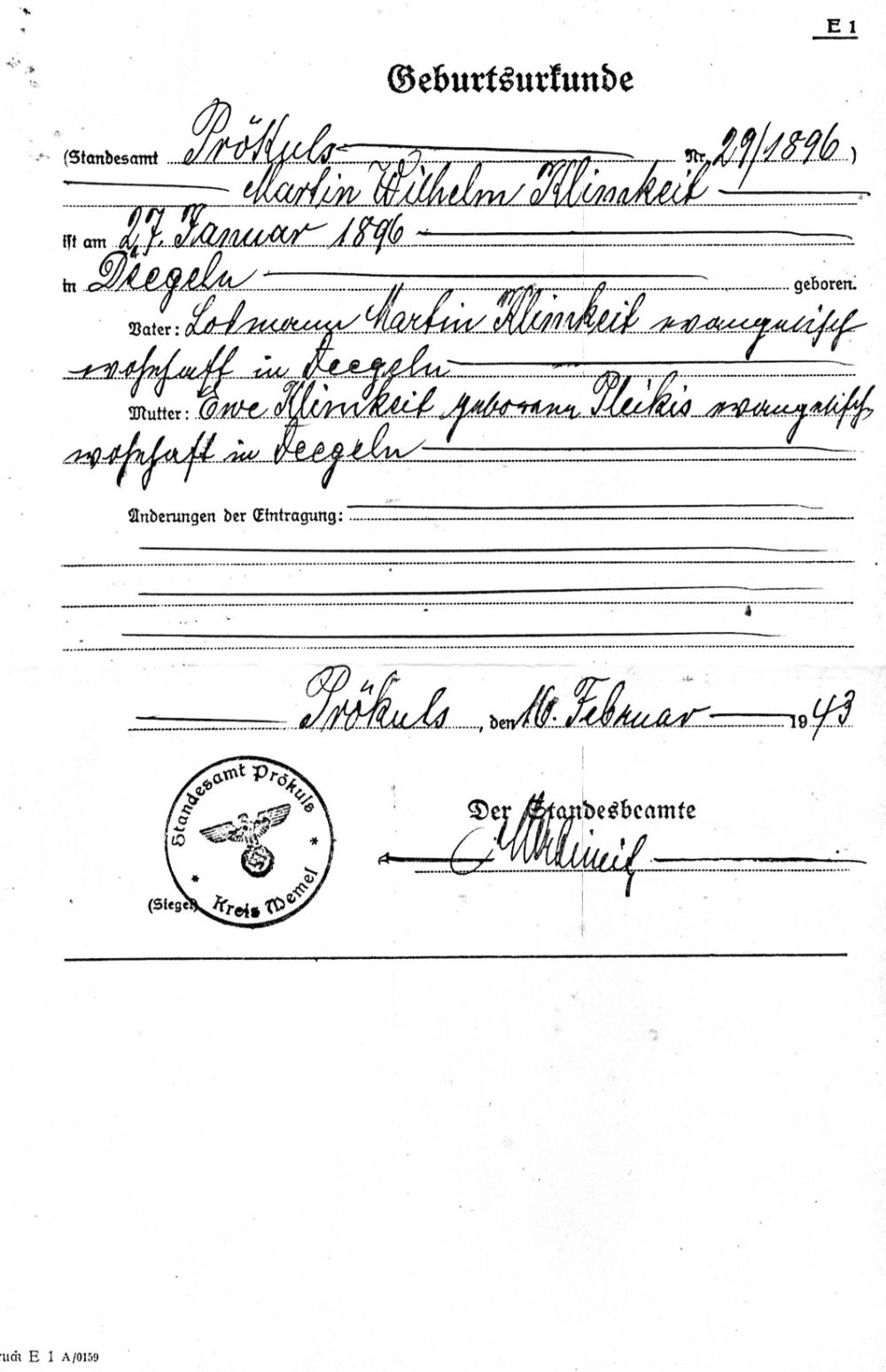| Geburt eines Sohns #2 | Wilhelm Martin KLIMKEIT 27. Januar 1896 (Alter 33 Jahre) Quelle: Geburtsurkunde |