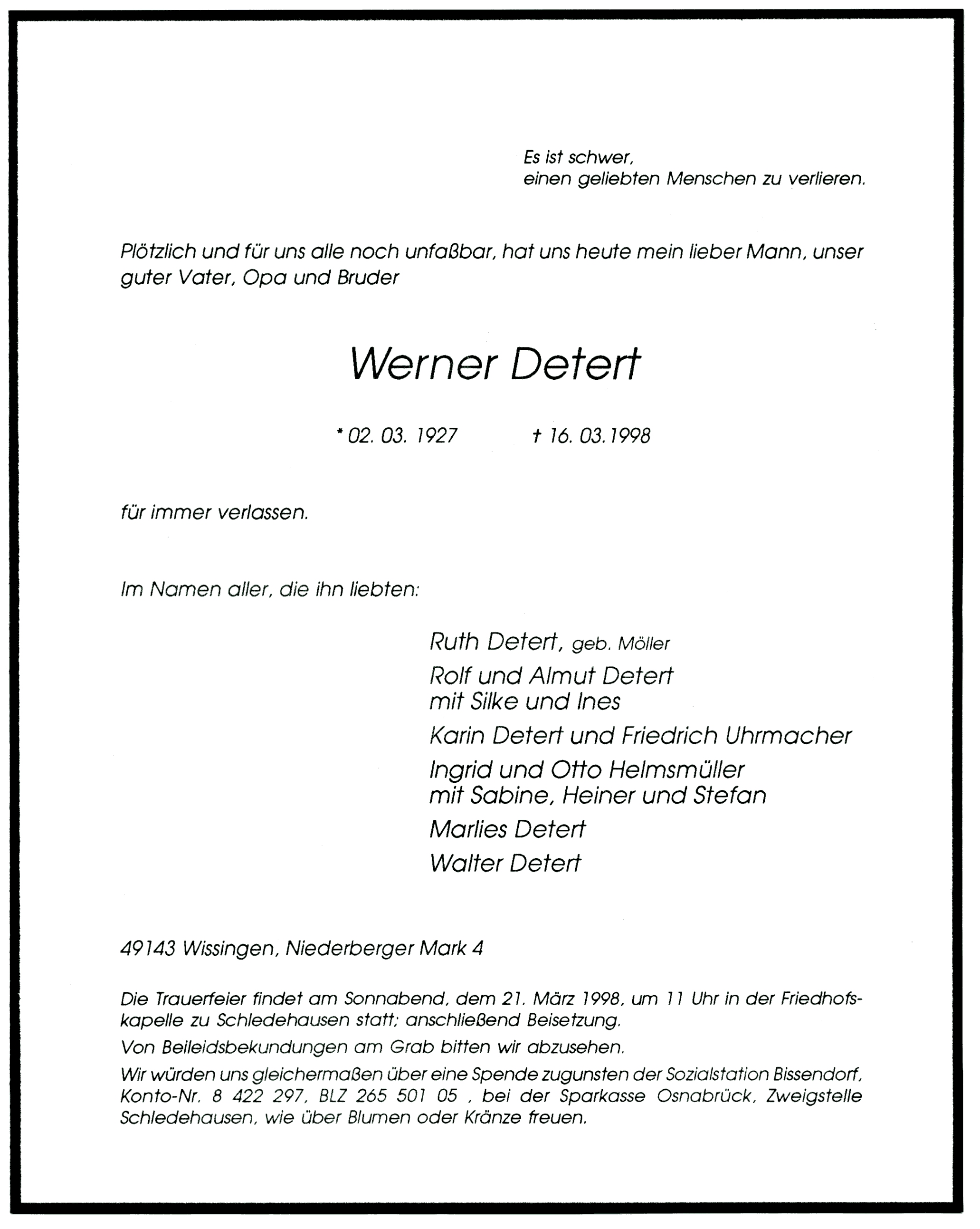 | Tod eines Bruders | Werner DETERT 16. März 1998 (Alter 69 Jahre) Quelle: Traueranzeige |