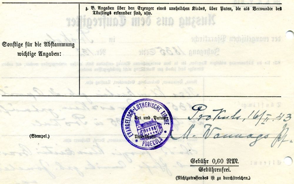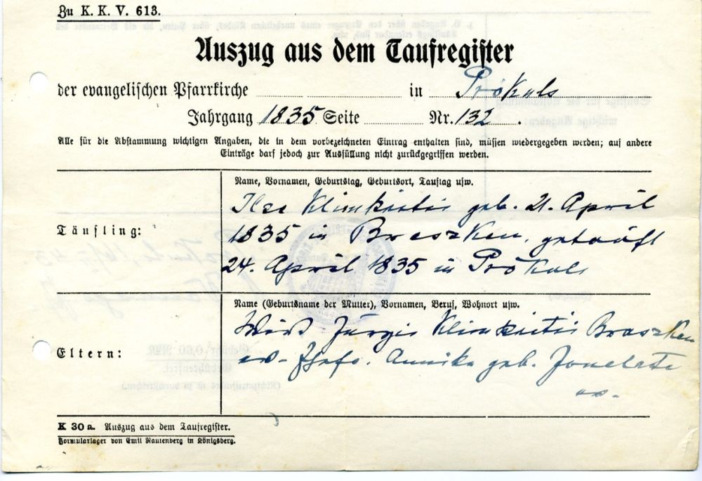 | Taufe einer Tochter | Ilse KLIMKEIT 24. April 1835 (Alter 22 Jahre) Quelle: Auszug aus dem Taufregister |