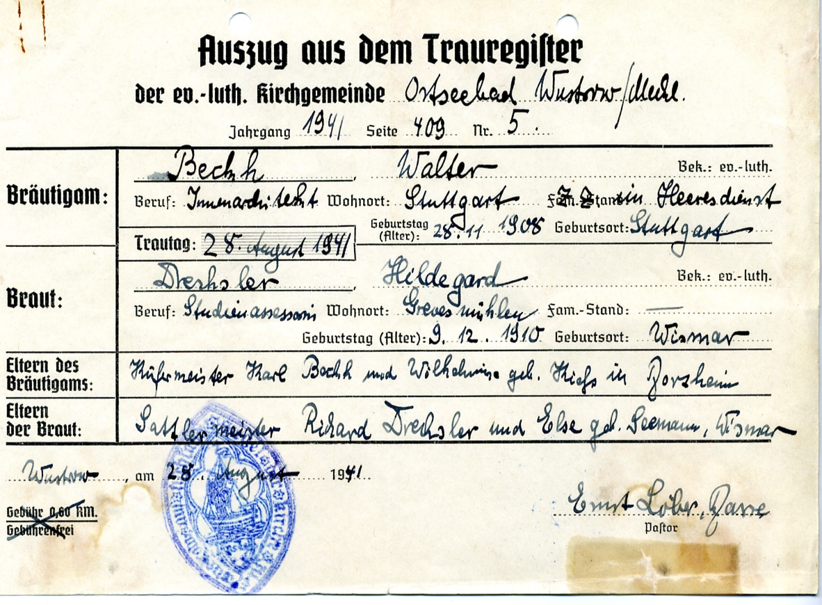 Heirat: 22. Januar 1909 — Wismar, Wismar, Mecklenburg-Vorpommern, DEUTSCHLAND |