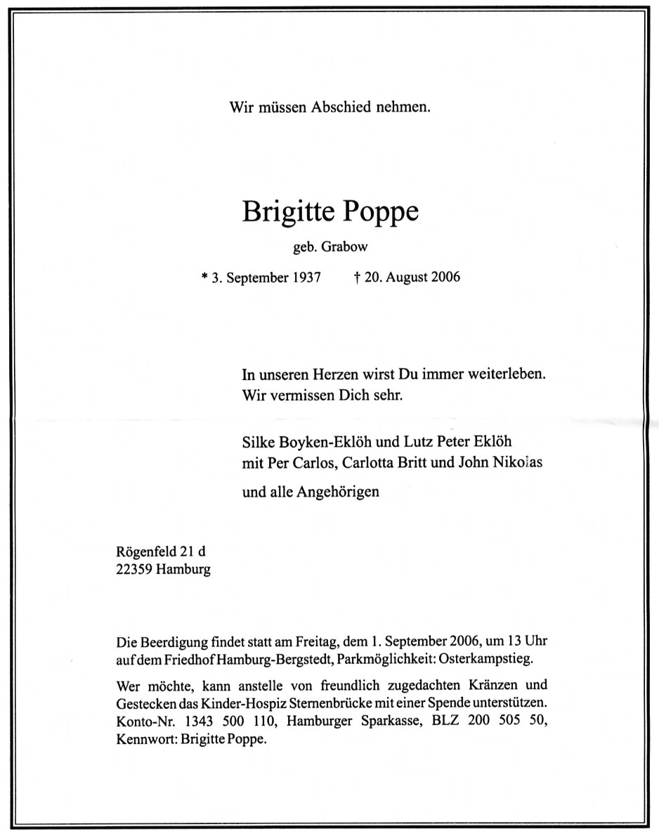 | Beerdigung | 1. September 2006 (12 Tage nach Tod) Quelle: Traueranzeige |
