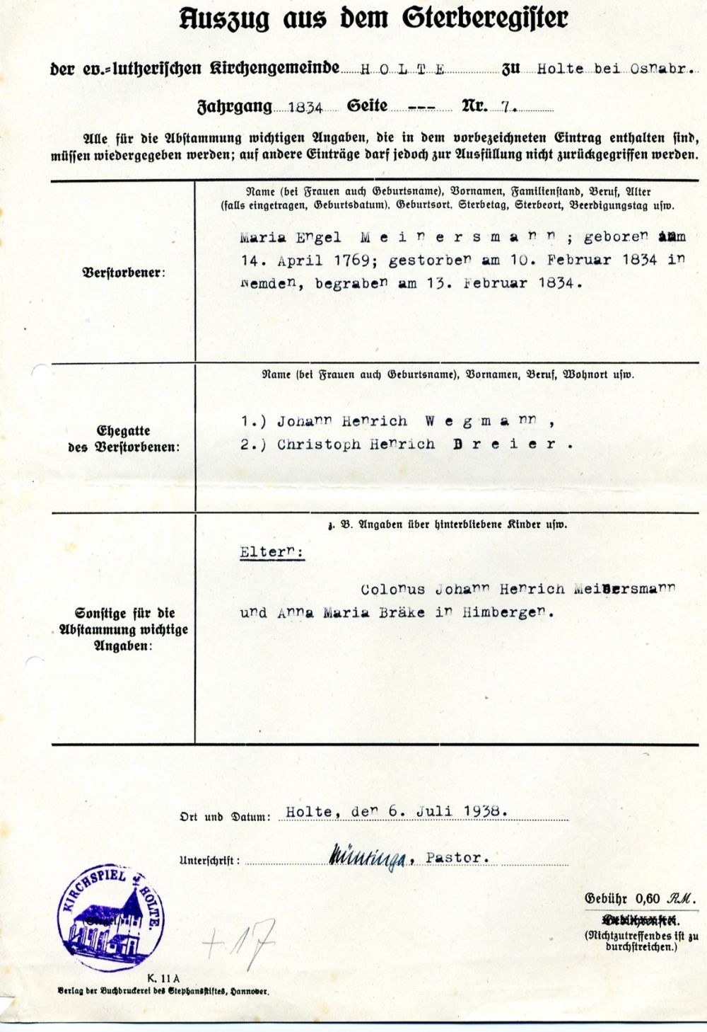 Heirat: 26. Oktober 1831 — Holte (Bissendorf), Osnabrück, Niedersachsen, DEUTSCHLAND |