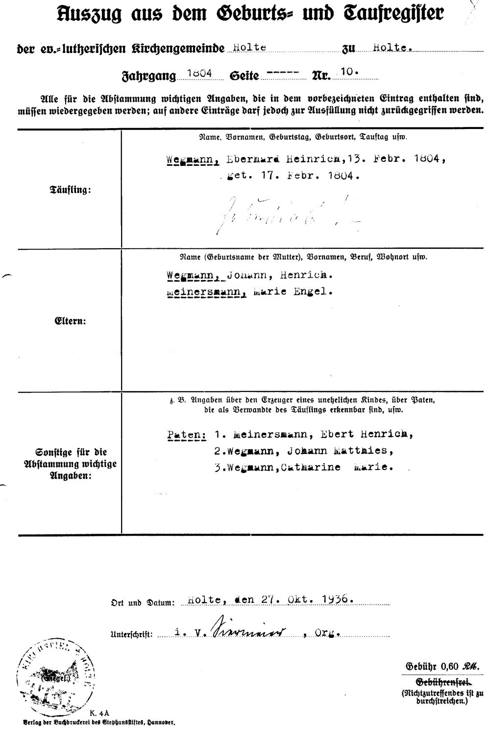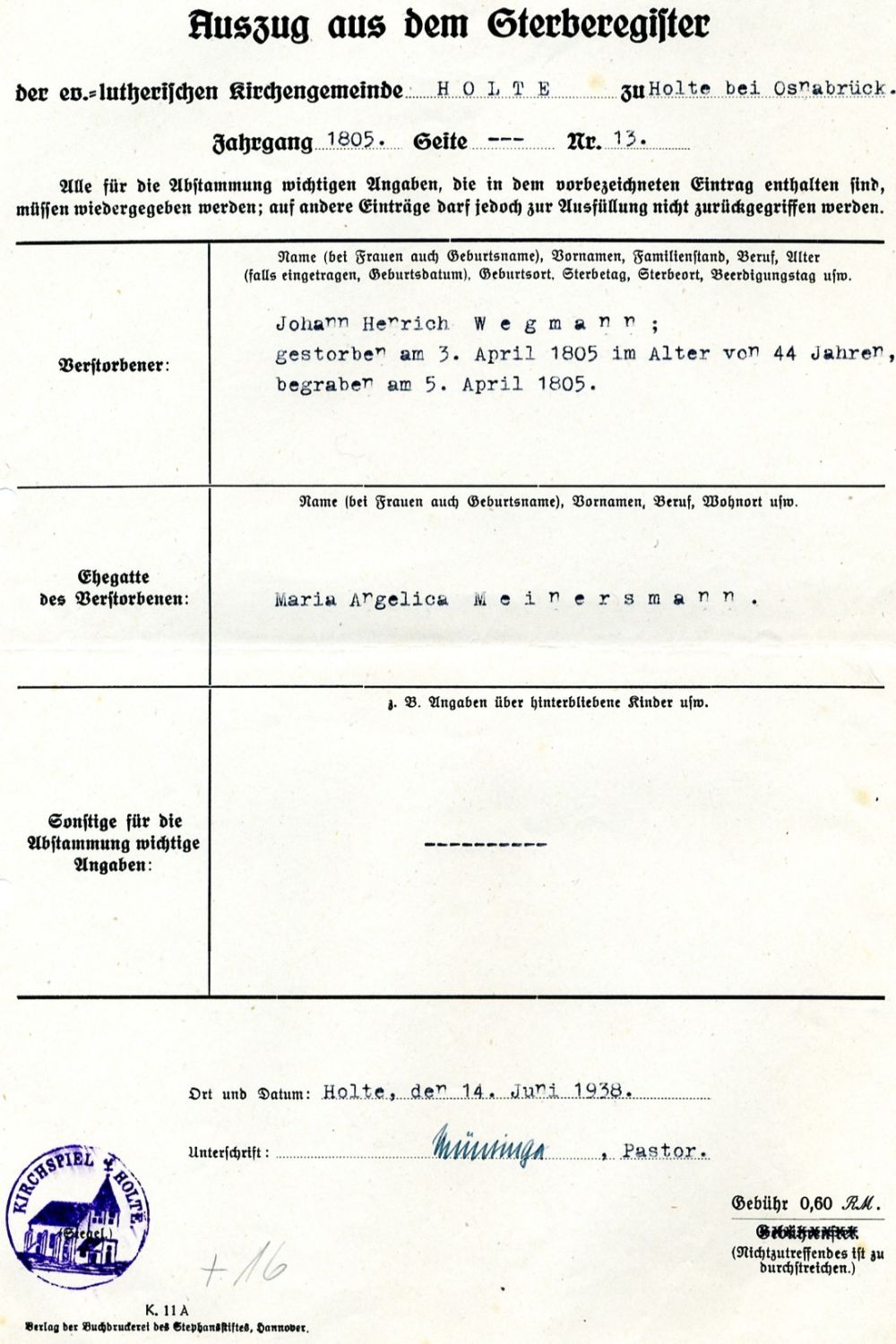 Johann Heinrich WEGMANN Geburt: 1761 27 24 — Holte (Bissendorf), Osnabrück, Niedersachsen, DEUTSCHLAND Tod: 3. April 1805 — Holte (Bissendorf), Osnabrück, Niedersachsen, DEUTSCHLAND |