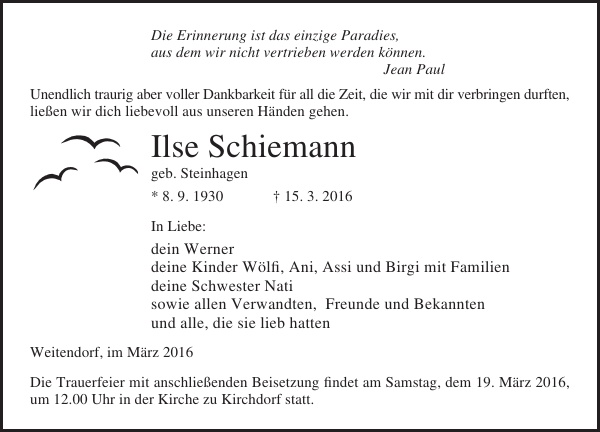 | Beerdigung | 19. März 2016 (4 Tage nach Tod) Quelle: Traueranzeige |