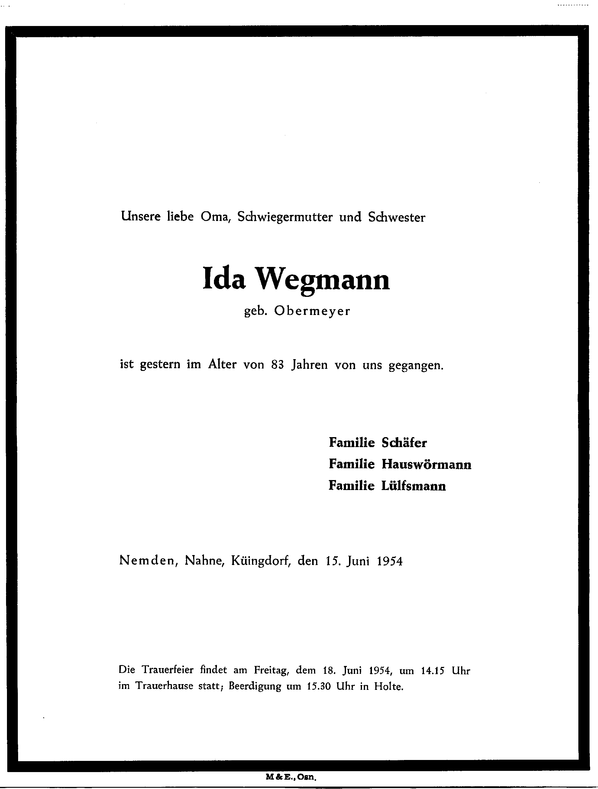 | Tod einer Ehefrau | Ida Maria Caroline OBERMEYER 14. Juni 1954 (Alter 88 Jahre) Quelle: Traueranzeige |