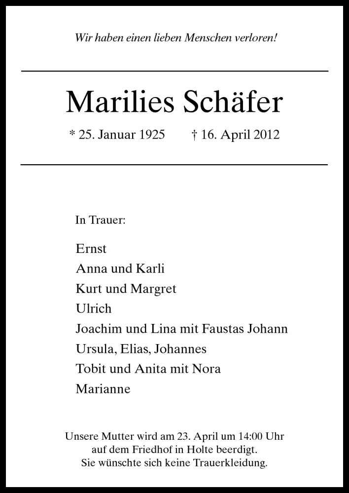 | Tod einer Tochter | Marilies (Marie Louise ?) HAUSWÖRMANN 16. April 2012 (Alter 115 Jahre) Quelle: Traueranzeige |