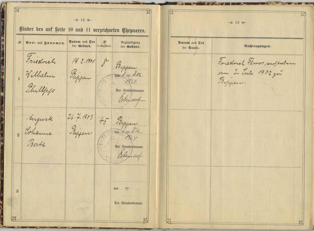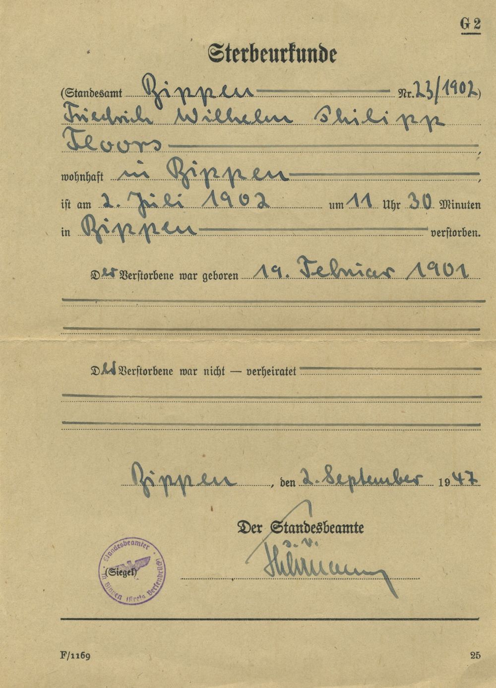 Geburt: 19. Februar 1901 44 32 — Bippen, Osnabrück, Niedersachsen, DEUTSCHLAND Tod: 2. Juli 1902 — Bippen, Osnabrück, Niedersachsen, DEUTSCHLAND |
