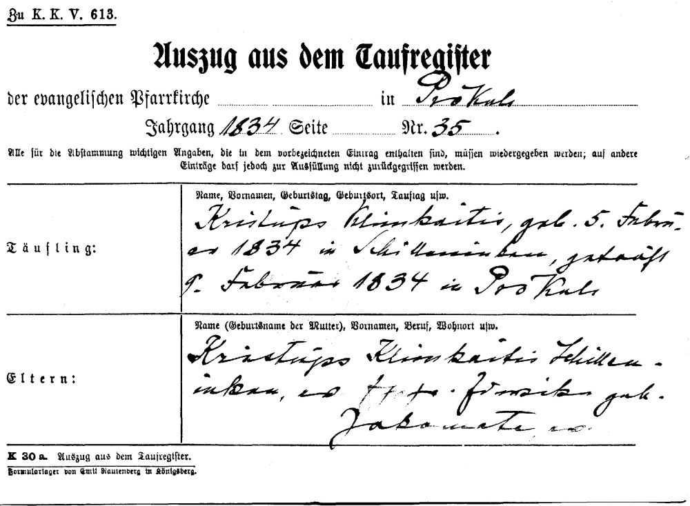 | Taufe eines Bruders | Christoph (Kristups) KLIMKEIT 9. Februar 1834 (Alter 2 Jahre) Quelle: Auszug aus dem Taufregister |