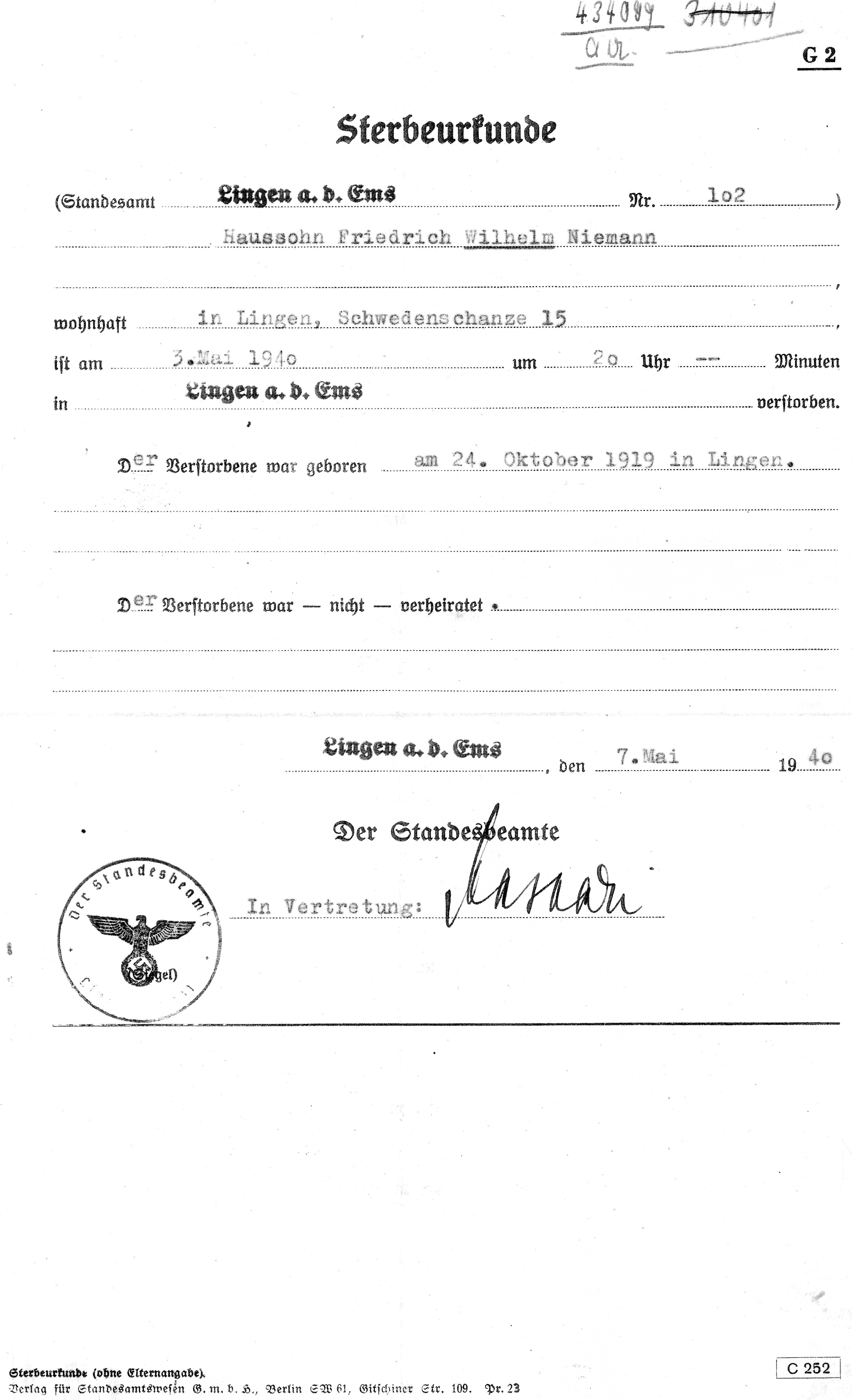 | Tod eines Sohns | Friedrich „Wilhelm“ NIEMANN 3. Mai 1940 (Alter 51 Jahre) |