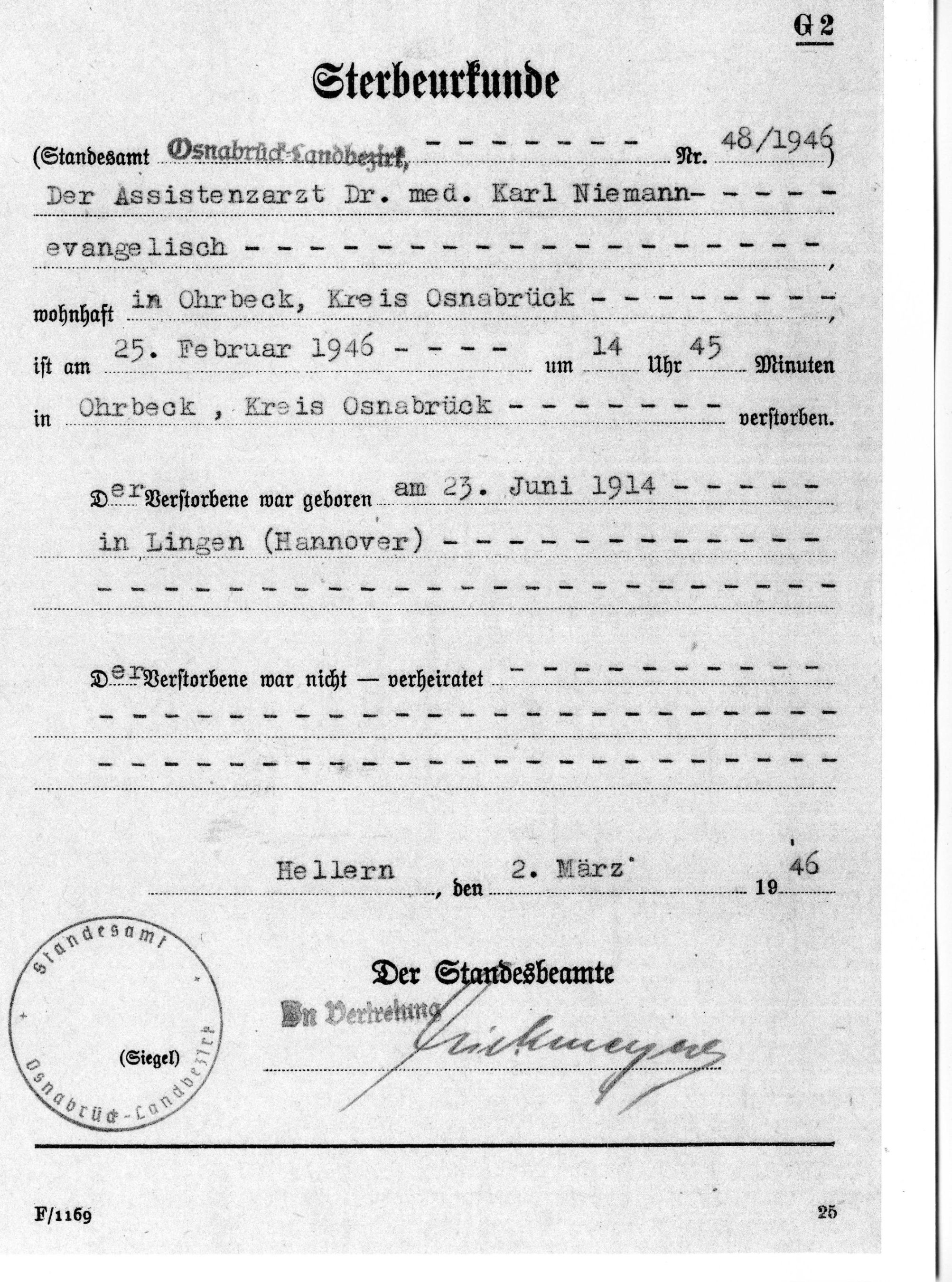 | Tod eines Sohns | Karl Heinrich August NIEMANN 25. Februar 1946 (Alter 57 Jahre) |