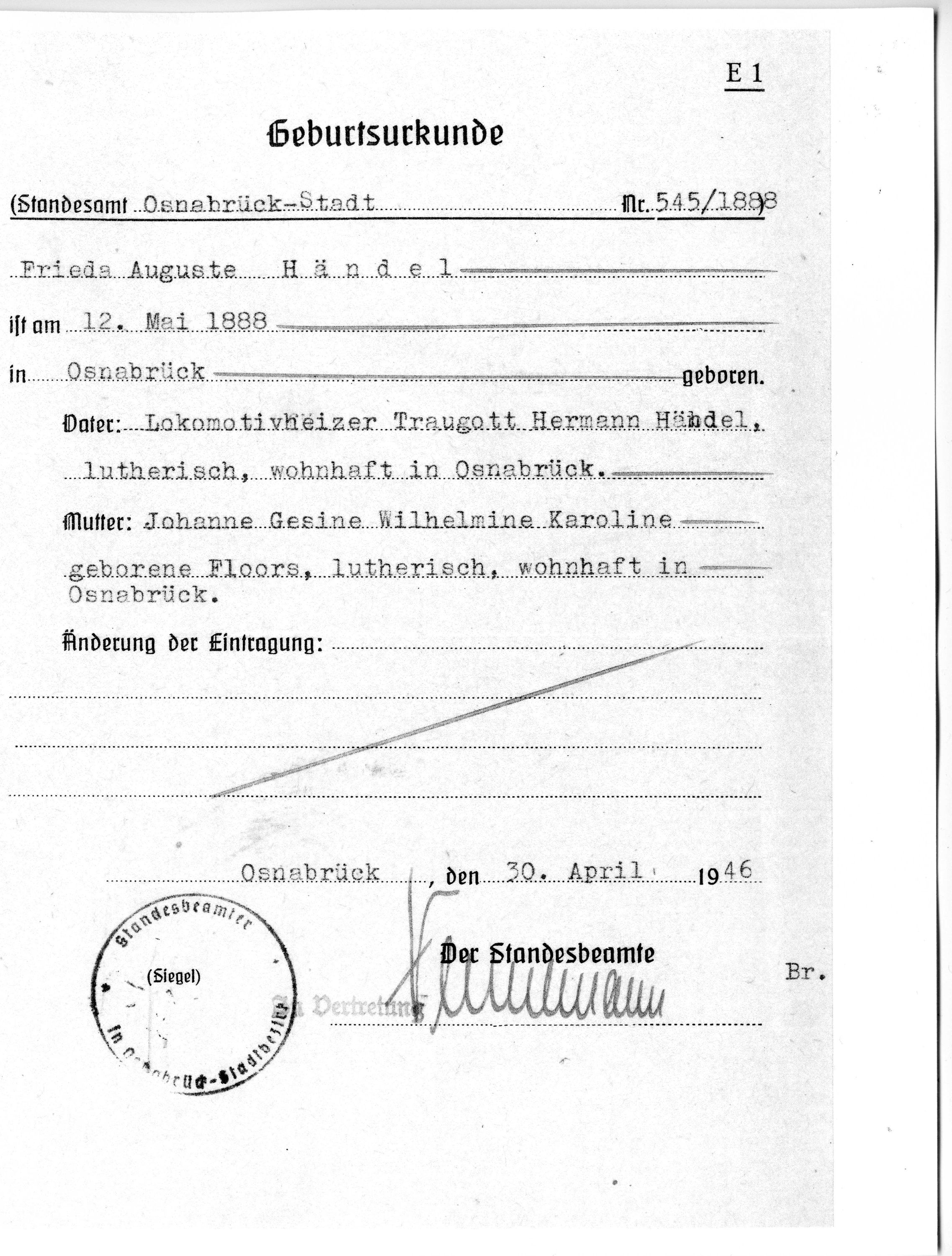 Frieda Auguste HÄNDEL Alter: 61 Jahre1888–1950