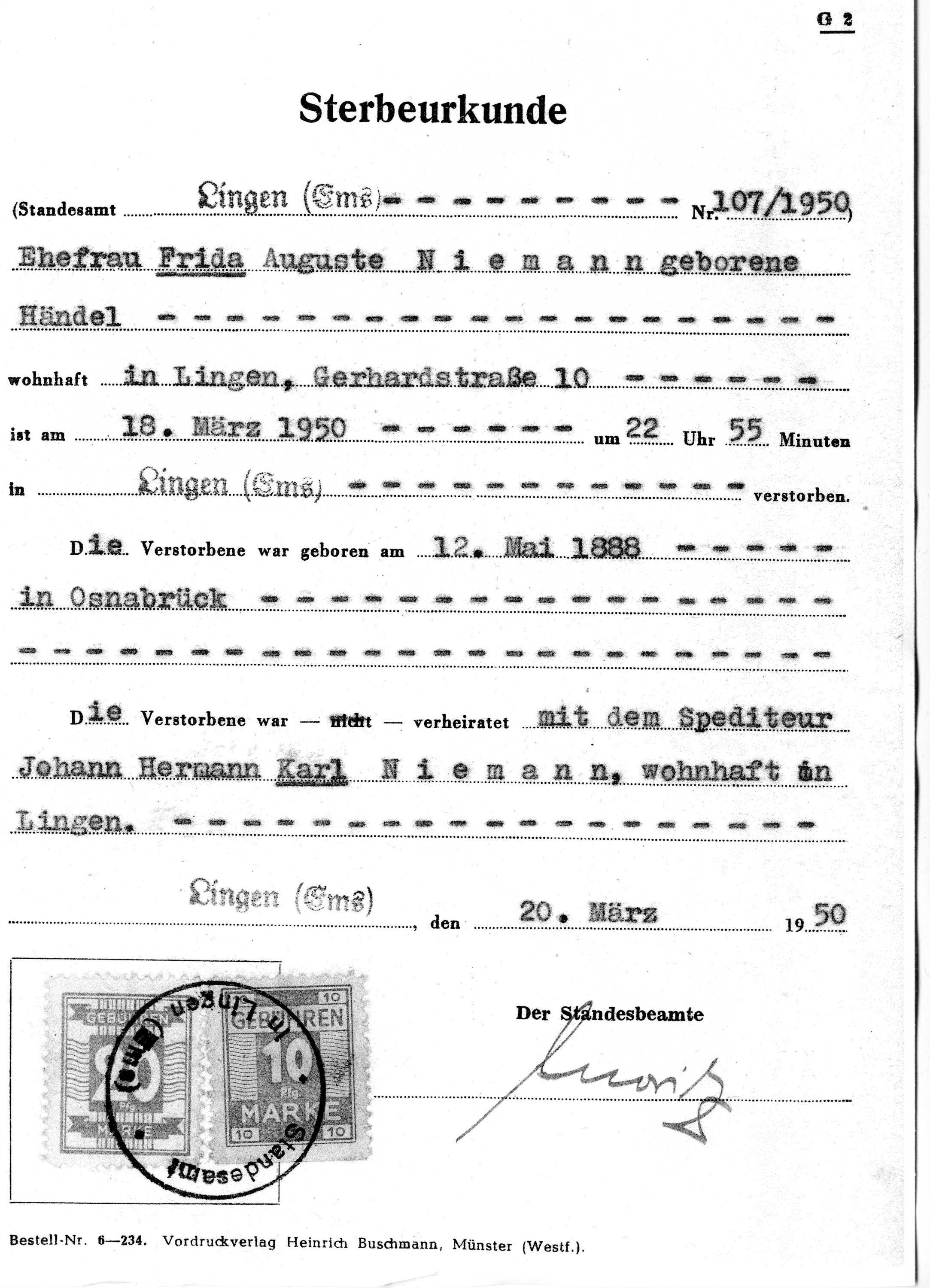 Geburt: 12. Mai 1888 36 27 — Osnabrück, Osnabrück, Niedersachsen, DEUTSCHLAND Tod: 18. März 1950 — Lingen, Emsland, Niedersachsen, DEUTSCHLAND |