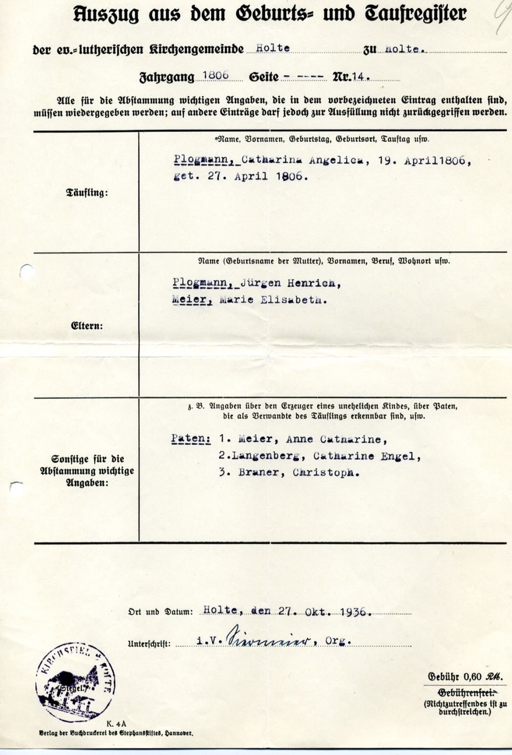 | Katharina Angelica PLOGMANN | 19. April 1806 | 219 | Holte (Bissendorf), Osnabrück, Niedersachsen, DEUTSCHLAND | 4 | 2. August 1886 | 139 | 80 | Holte (Bissendorf), Osnabrück, Niedersachsen, DEUTSCHLAND | F | YES | YES | |||||